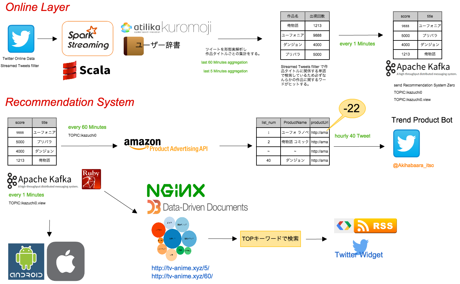 またクローンだけでは面白くないので、内部でSpark(集計) -> Kafka(レポート結果の受送信) -> Ruby (集計に基づくレコメンド)
