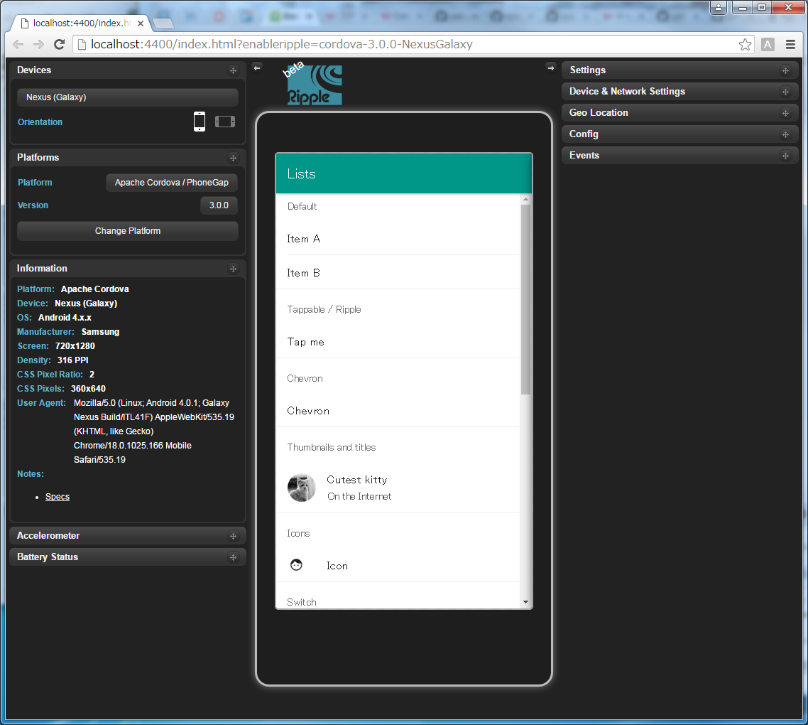 これだけで簡単にハイブリッドアプリ開発のベースとなるCordovaプロジェクトを構築できました。Android SDKがインストールされていれば、Androidエミュレータや実機上にもビルドしてデバッグすることもできますので、実装段階に応じて使い分けるとよいかと思います。