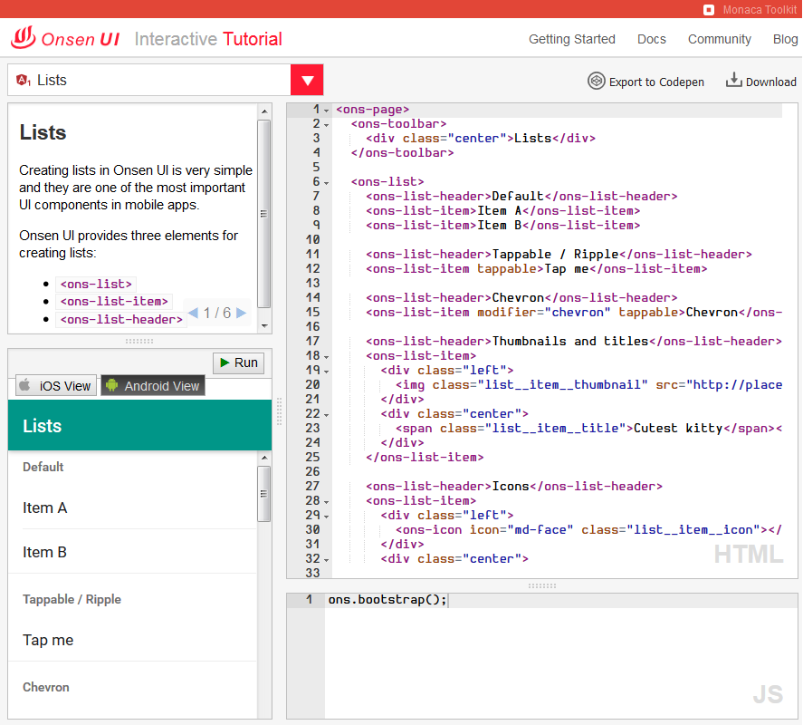 OnsenUIにはTutorial用サイトが用意されており、ここからテンプレートを選択してCordovaプロジェクトとしてダウンロードすることができます。OnsenUIはAngularJS 1をベースとして開発されてきましたが、V2ではReact.JSをベースとしたコンポーネントも開発されています。また、AngurarJS 2にも対応する予定だそうです。TutorialではベースをjQueryかAngularかReactから選択してダウンロードすることができますので、お好みのものを選択してください。