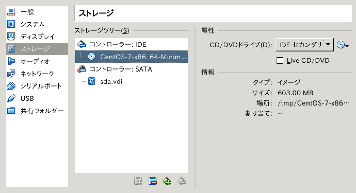 VirtualBoxのストレージ設定を開き、CentOSのISOイメージを取り除きます。