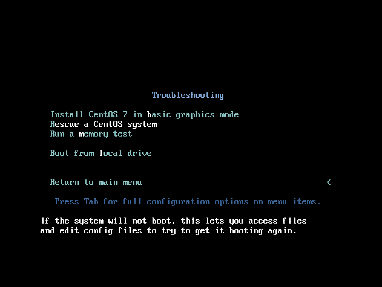 インストールディスクが起動したら、「Troubleshooting」を選択し「Rescure a CentOS system」