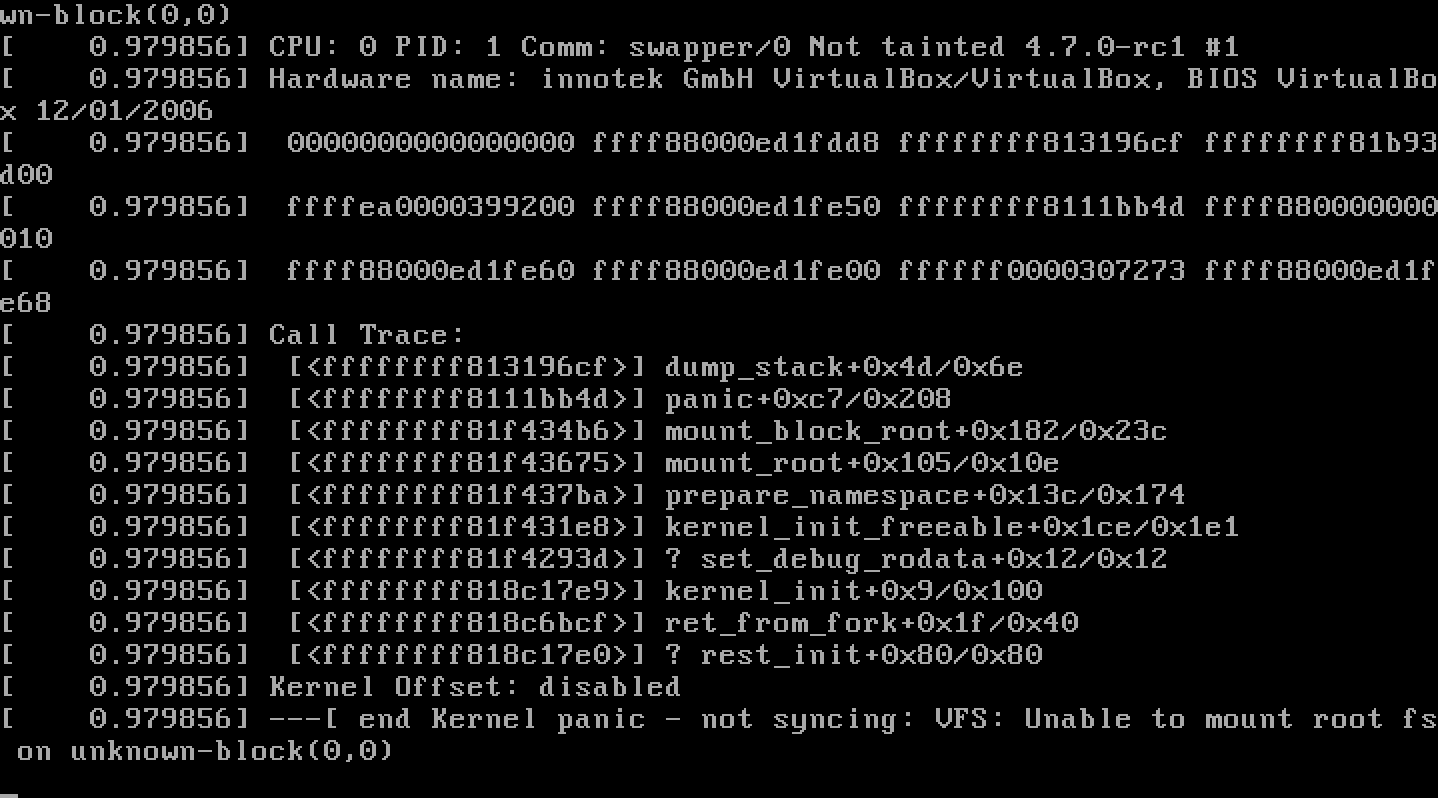カーネルは起動完了後に/sbin/initを実行しますが、まだ/sbin/initを用意していないため