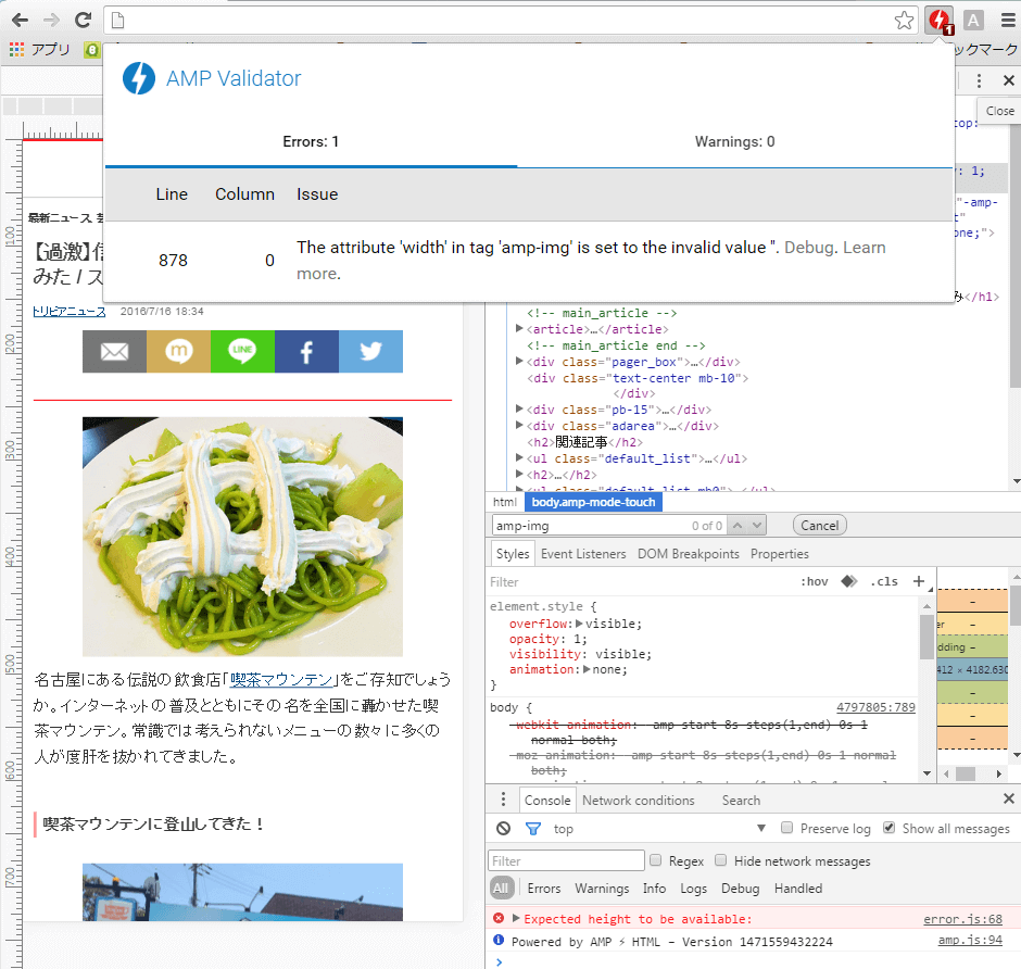 ただGoogle Chromeを使用されているのであれば、Chromeの拡張機能として「AMP Validator」を入れれば先ほどのハッシュを付けずとも、下の画像のようにエラーログを表示してくれます。