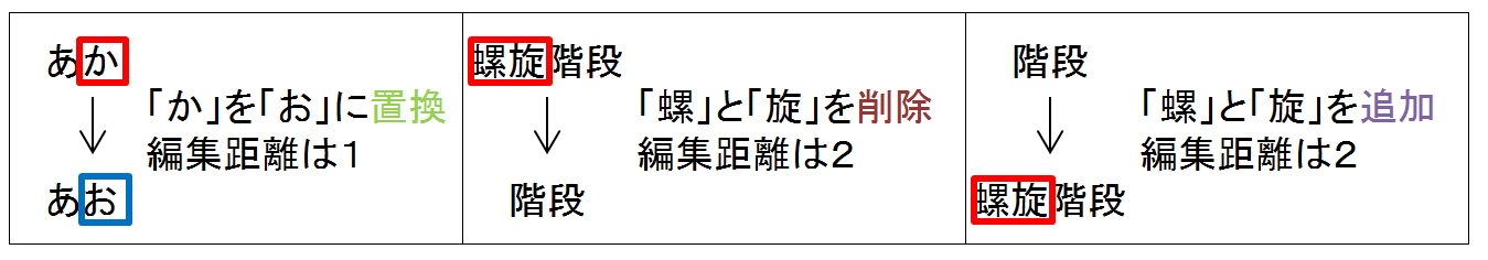 具体的には、1文字の挿入・削除・置換によって、一方の文字列をもう一方の文字列に変形するのに必要な手順の最小回数として定義される