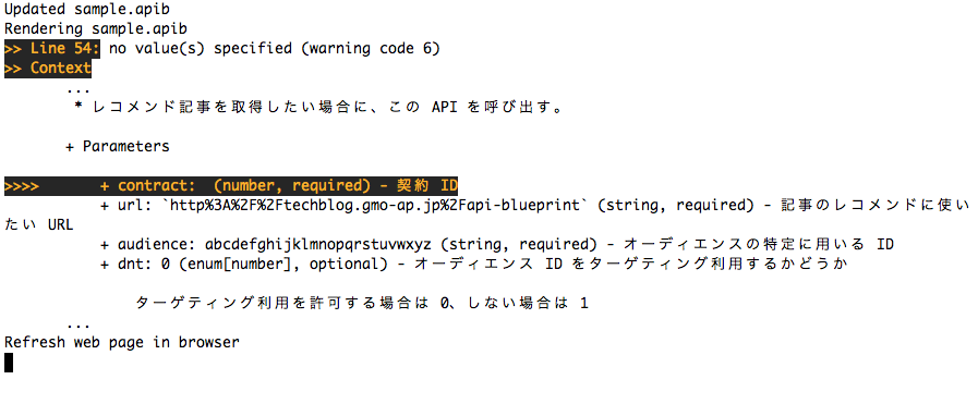 ちなみに、aglio は aglio でしか使えない拡張表現(注意点をブロック表示する ::: warning など)にも対応しています。