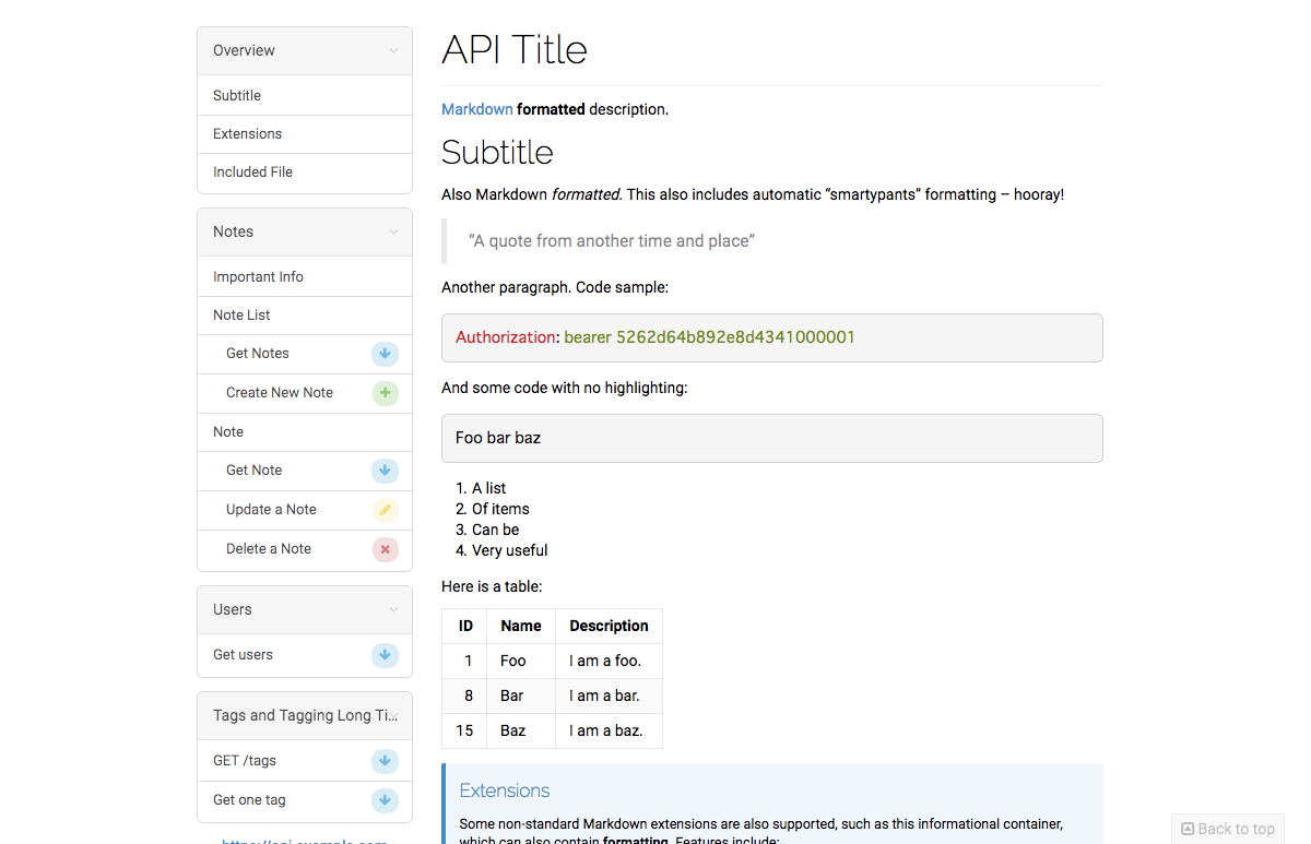 例えば、aglio のページにある例(HTML)の Overview の部分や、Notes API の先頭に書かれた “Important Info” の部分は、Markdown で書かれた説明です。リンク、引用、リスト、表などが自由に使えることがわかると思います。