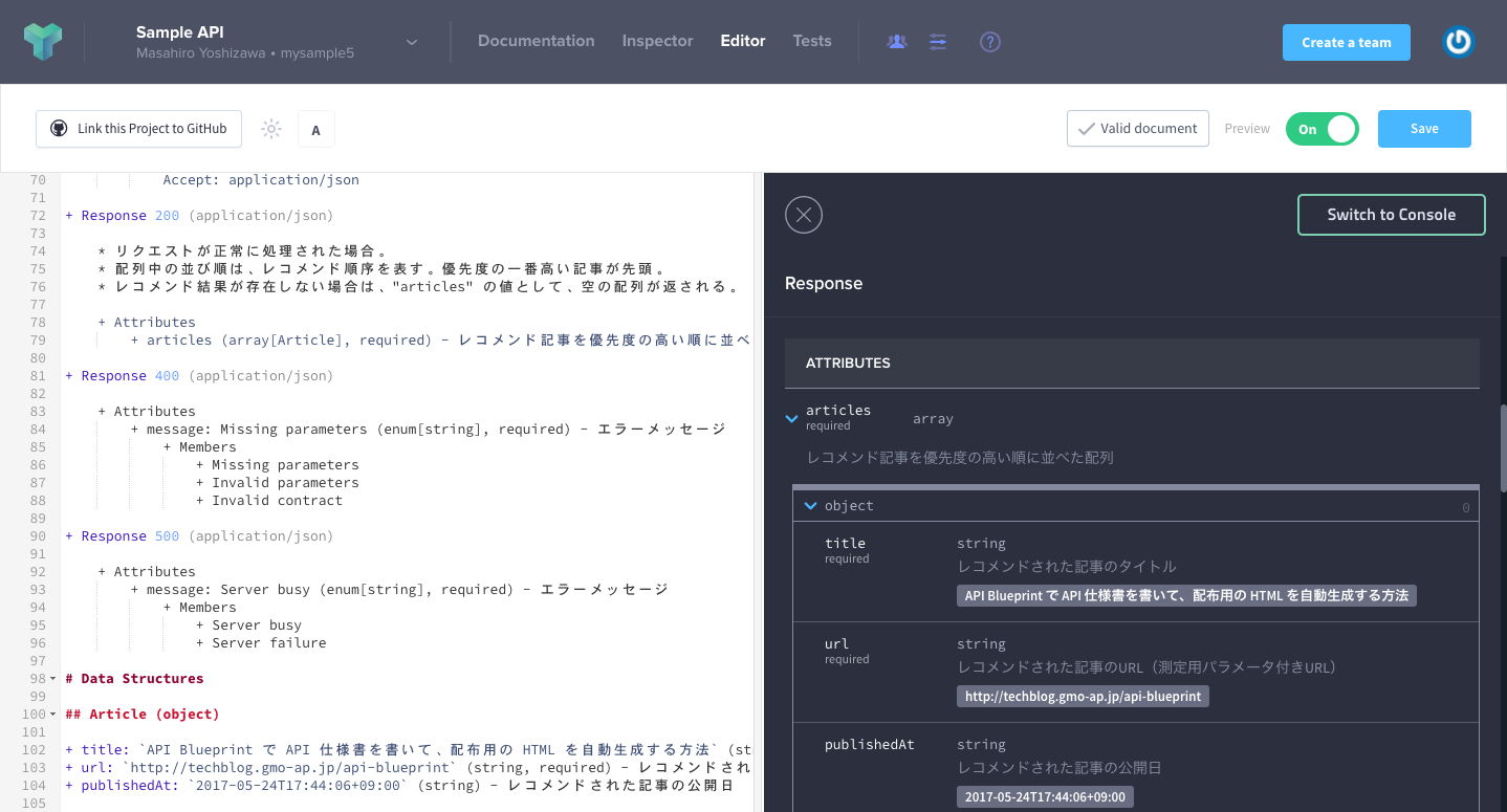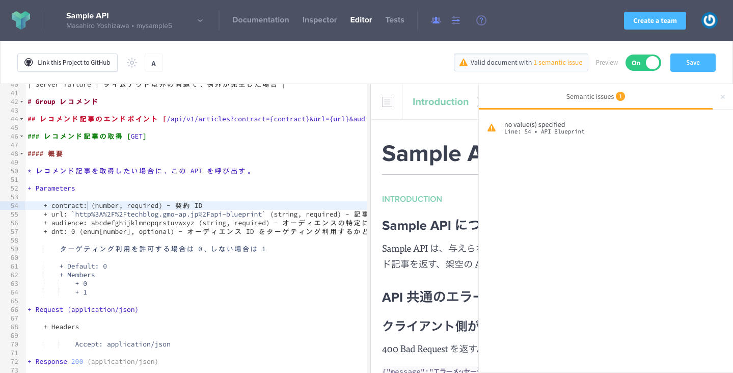 ちなみに、HTML ファイルの生成にこだわらないのであれば、Apiary にアカウントを作って、Apiary の Editor を使うこともできます。Apiary Editor は、swagger-editor と同様に Web ブラウザ上で編集可能で、文法エラーをリアルタイムに表示してくれます。