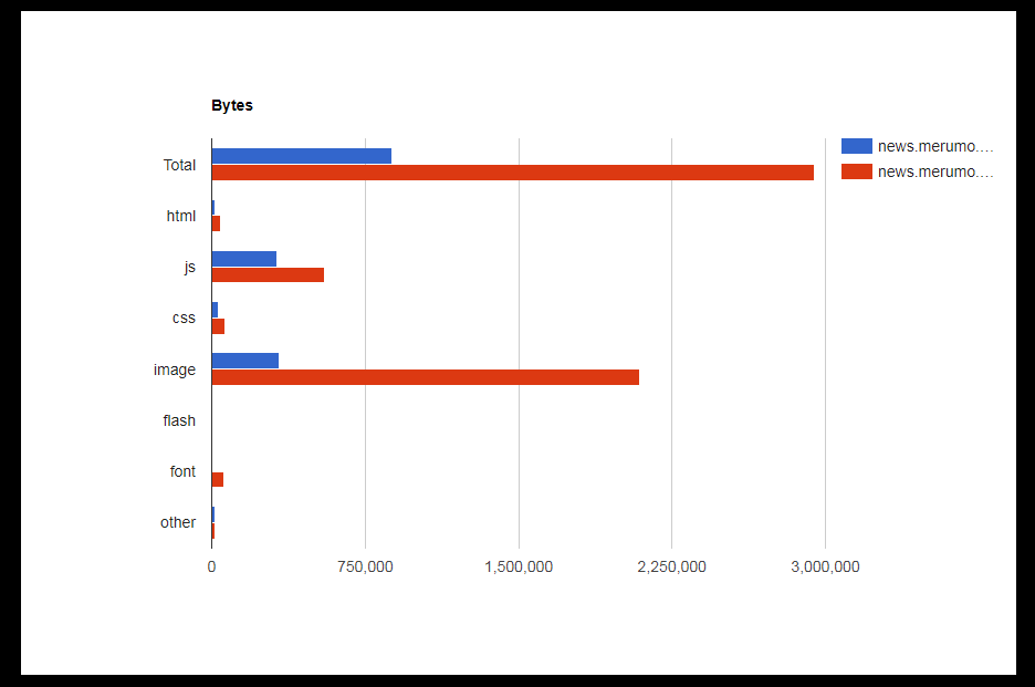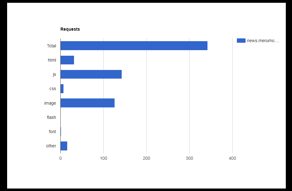 今までも全く気付いていなかったわけではないのですが、先の「WebPagetest」で他のニュースサイト様の分析をしても、Yomerumoのリクエスト数の多さが表示速度に影響を与えているのは明らかでした。
