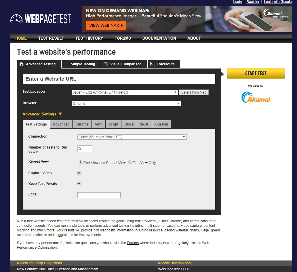 ChromeのDevツールでも「Performance」を使えばビデオキャプチャを確認できますが、「WebPagetest」であれば先の「Speed Index」のスコアとあわせてビデオキャプチャも撮れます。