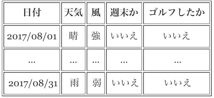 例えば、ある人(山田さん)はゴルフが好きで、時々ゴルフ場へ出かけます。以下の表に山田さんが過去一ヶ月間にゴルフ場へ行った履歴と天気、風、週末などの情報を合わせて集計しました。この情報でDecision Treeのモデルを訓練して今日山田さんゴルフ場へ行くかを予測します。