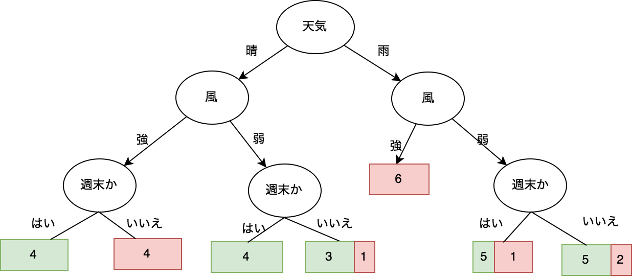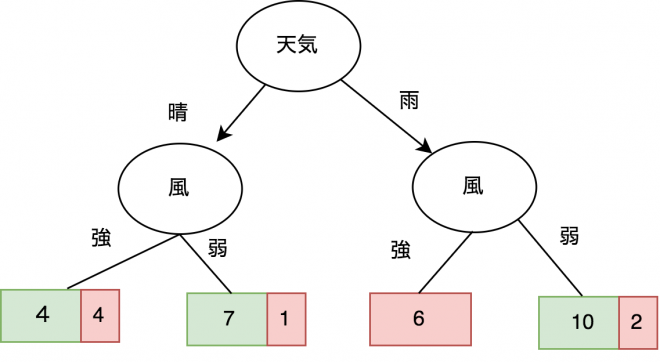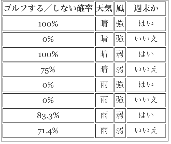 次に、分割されたデータをさらに「風」の情報で分割します。図2は分割された結果です。分割された結果からみると雨が降ってるかつ風が強い時に山田さんはゴルフへ行かず、晴れてるかつ風が弱い、雨かつ風が弱い時にゴルフへ行く可能性が高いことがわかります。ただし、風が強いかつ晴れの時に山田さんがゴルフへ行くかどうかはまだ判別が難しいです。