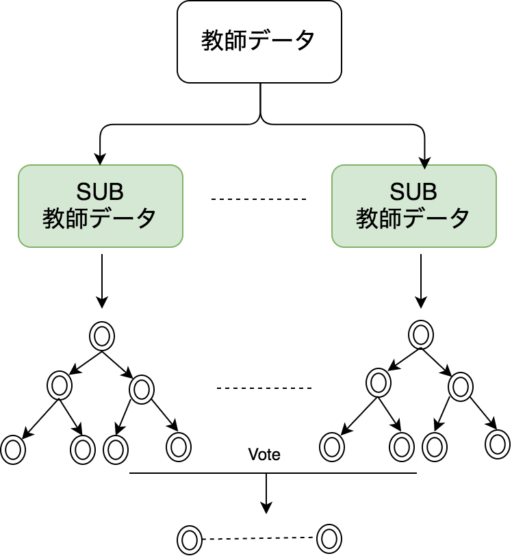 - 教師データを復元抽出し、N分の新しいデータセットを作成します。よく使われる抽出されたデータセットのサイズはもとのデータセットサイズの平方根です。