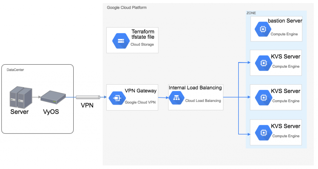 gcp ├── backend.tf # GCSにtfstateファイルを保存するための設定 ├── bastion.tf # bastionServerを構築するための設定 ├── firewall.tf # GCP上のファイアウォールルールを設定 ├── instancegroupes.tf # 構築するKVSサーバをインスタンスグループに登録する設定 ├── internallb.tf # 内部ロードバランサ用の設定 ├── kvs.tf # KVSサーバを構築するための設定 ├── network.tf # カスタムVPCネットワークを構築する設定 ├── provider.tf # GCPに接続するための資格情報、プロジェクト名、リージョンを設定 └── variables.tf # 各設定ファイル内で使用する変数を設定 |