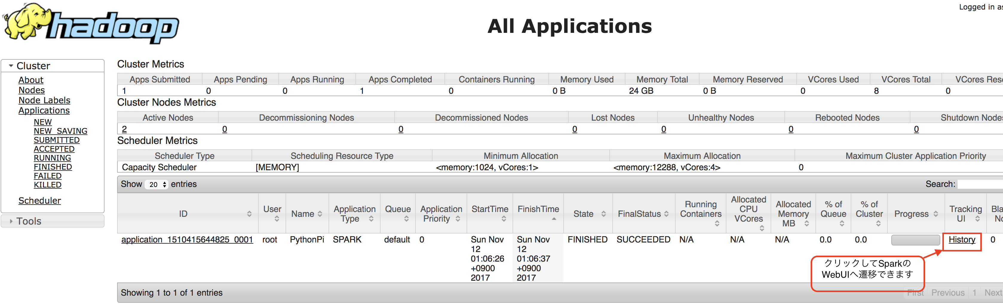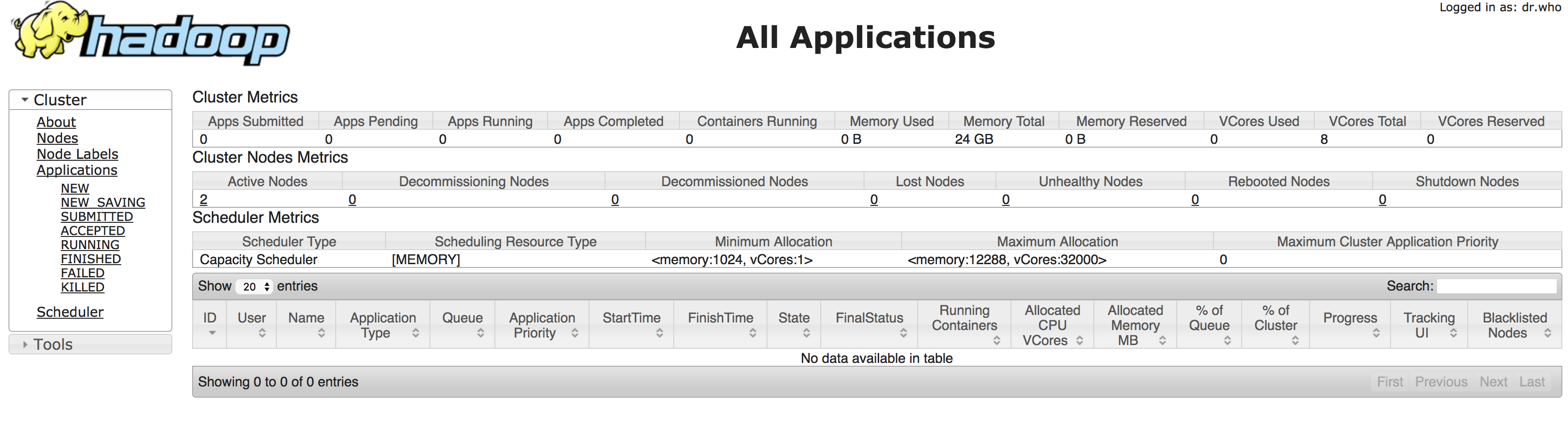 Operating System Default Path of Google Chrome Mac OS X /Applications/Google\ Chrome.app/Contents/MacOS/Google\ ChromeLinux /usr/bin/google-chromeWindows C:\Program Files (x86)\Google\Chrome\Application\chrome.exe - 起動したChromeでhttp://[MasterNodeのInstance名]:8088へアクセスします。