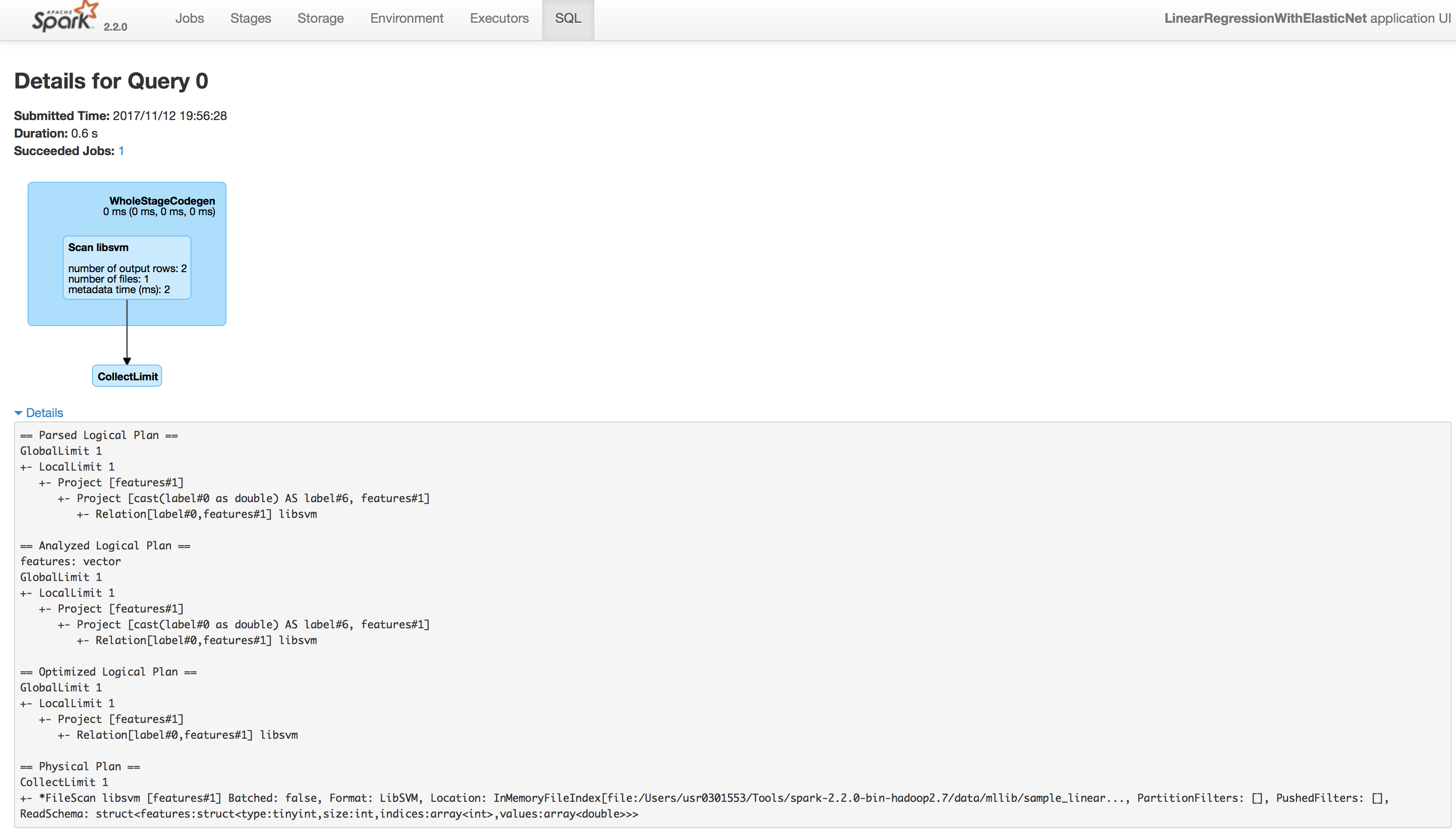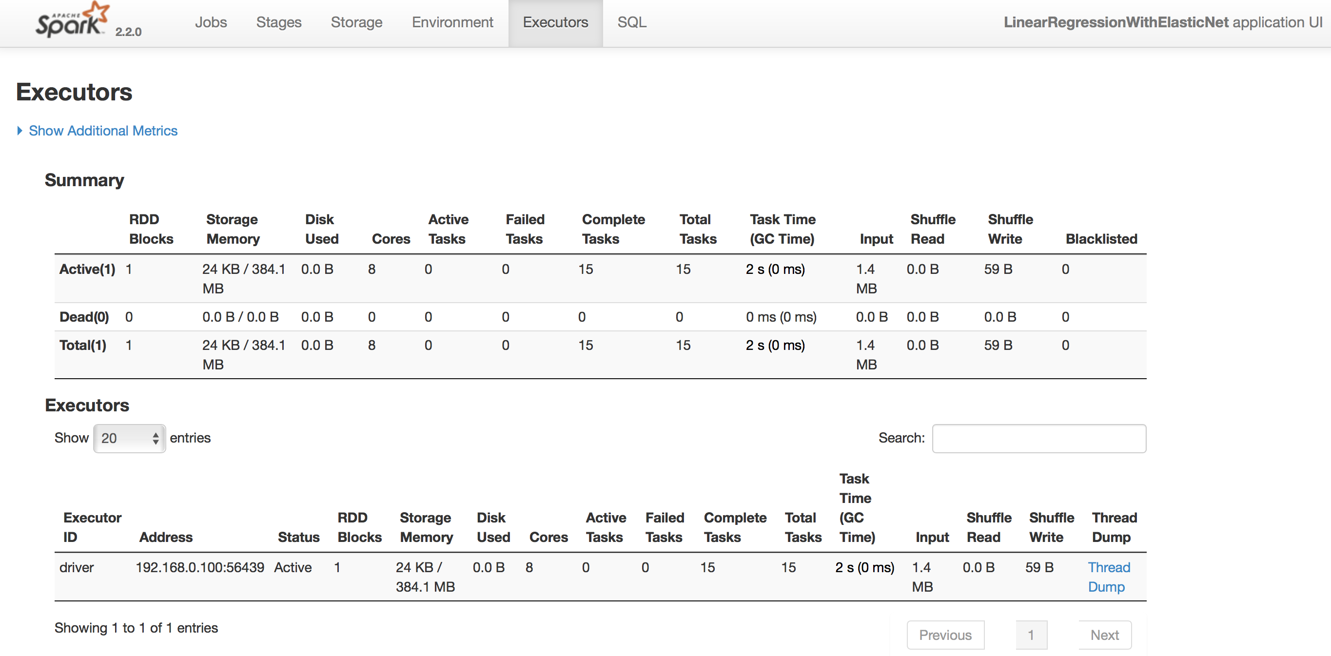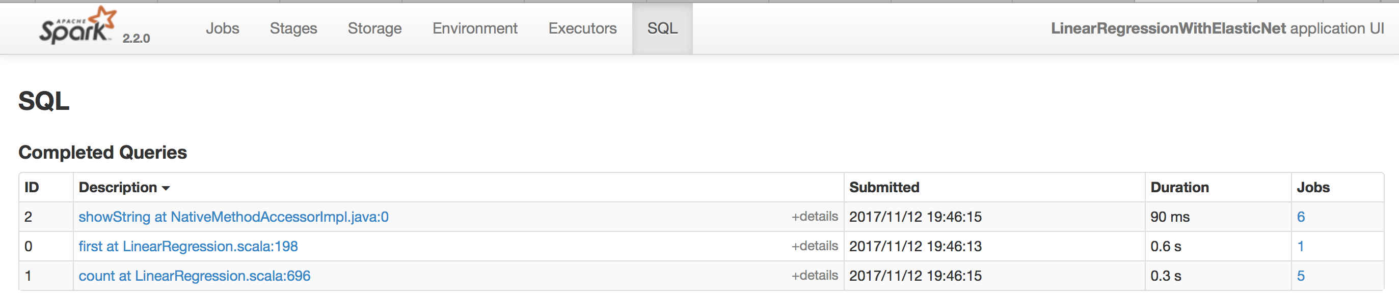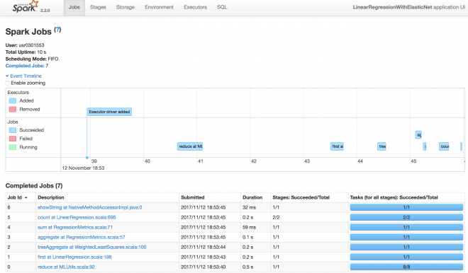 1./bin/spark-submit examples/src/main/python/ml/linear_regression_with_elastic_net.py data/mllib/sample_linear_regression_data.txt - SampleCodeが動作しているときにBrowserへMaster NodeのIPやPortを入力してWebUIへアクセスします(Standaloneの場合はhttp://127.0.0.1:4040/jobs/を入力します)。