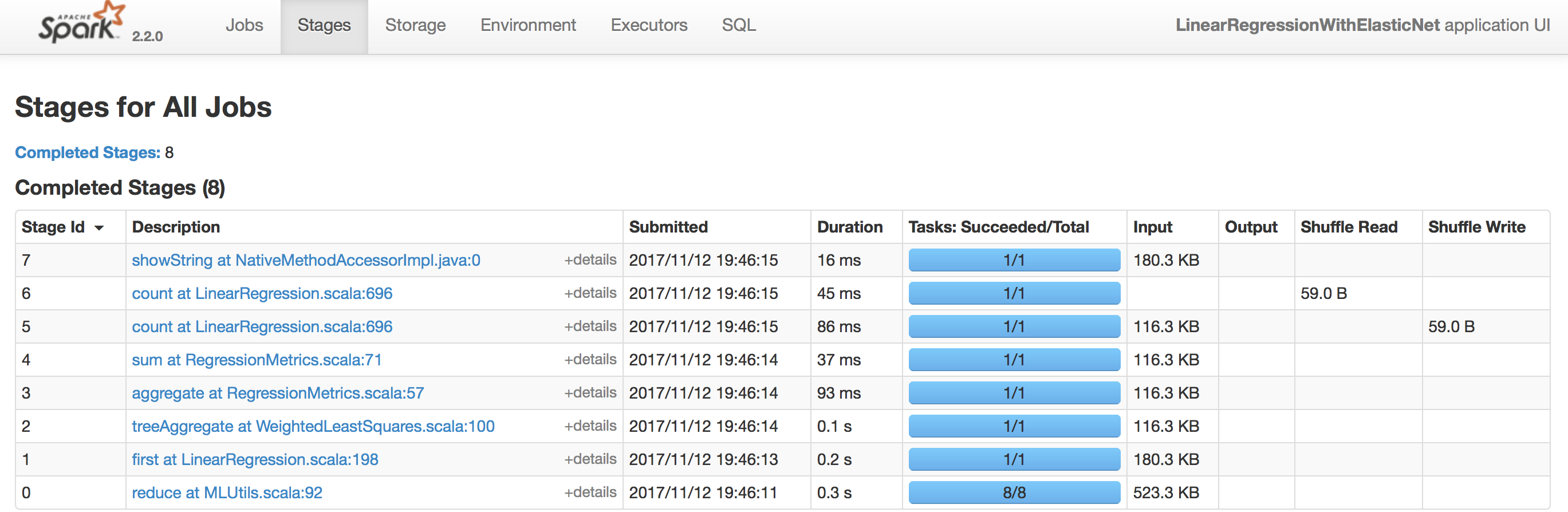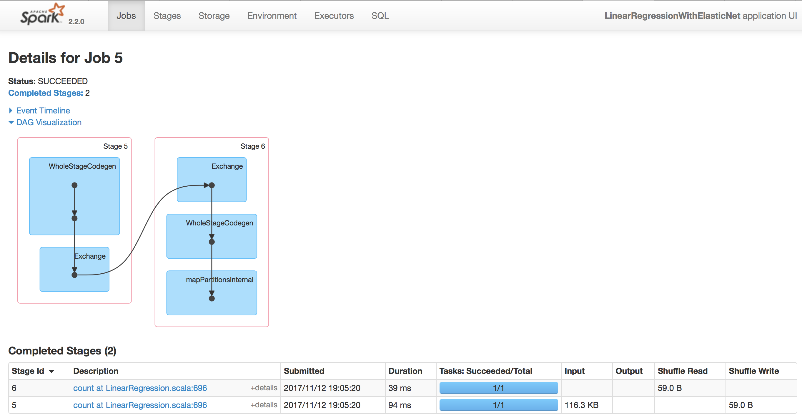 今回は例としてJob 5(count at LinearRegression.scala:696)をクリックしてみます。