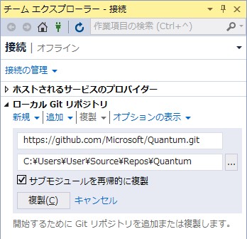 「複製」をクリックし、上段のテキストボックス(複製するGitリポジトリのURLを入力してください)にURL:https://github.com/Microsoft/Quantum.git を入力する。