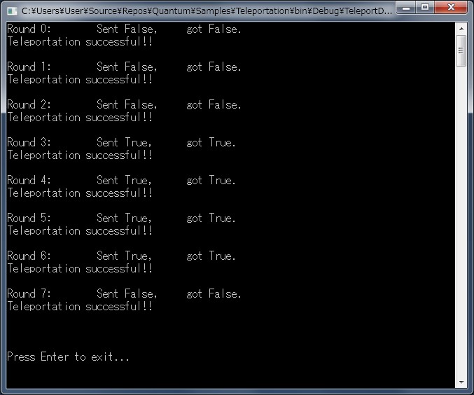 詳細な原理を知りたい方はWikipedia(量子コンピュータ、2018年1月10日、ウィキペディア日本語版、https://ja.wikipedia.org/wiki/%E9%87%8F%E5%AD%90%E3%82%B3%E3%83%B3%E3%83%94%E3%83%A5%E3%83%BC%E3%82%BF)を参照いただくとして「Press Enter to exit…」が表示されたらシミュレーション完了。「Enterキー」を押してコンソール画面を閉じる。