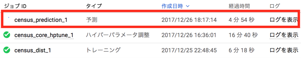 $ gcloud ml-engine jobs describe $JOB_NAME createTime: '2017-12-27T09:27:14Z' etag: X-_4ecURJvw= jobId: census_keras_prediction_1 ... startTime: '2017-12-27T09:27:15Z' state: RUNNING |