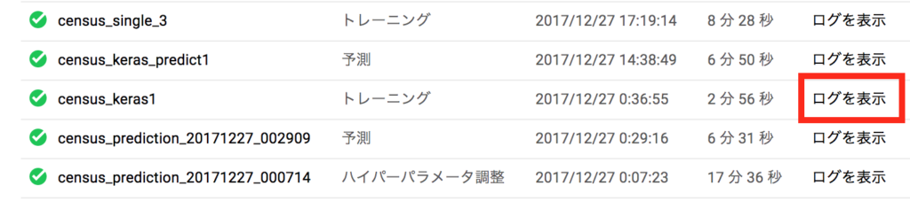 Cloud ML Engineが実行したトレーニングジョブの標準出力及び、標準エラー出力、ログはStackdriver Logging に保存されており、実行中、実行後問わずに参照が可能です。