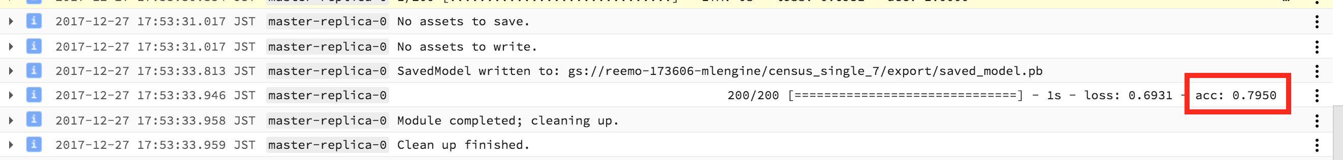 Cloud ML Engineが実行したトレーニングジョブの標準出力及び、標準エラー出力、ログはStackdriver Logging に保存されており、実行中、実行後問わずに参照が可能です。