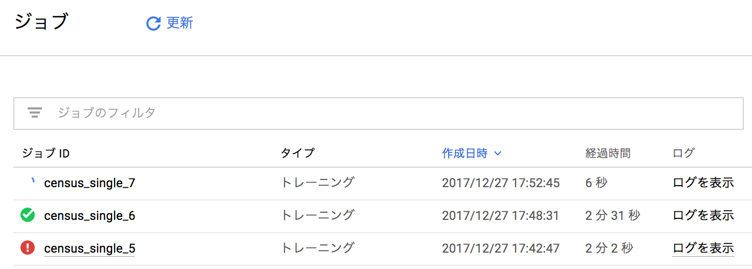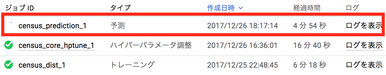 $ gcloud ml-engine jobs describe $JOB_NAME createTime: '2017-12-27T09:27:14Z' etag: X-_4ecURJvw= jobId: census_keras_prediction_1 ... startTime: '2017-12-27T09:27:15Z' state: RUNNING |
