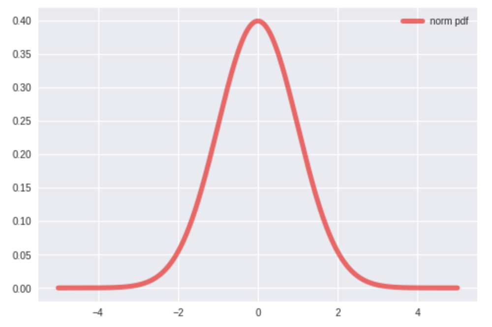 import numpy as np import matplotlib.pyplot as plt from scipy.stats import norm fig, ax = plt.subplots(1, 1) # -5.0から5.0の数値を10000等分した値 x = np.linspace(-5.0, 5.0, 10000) # 標準正規分布で計算する f = norm.pdf(x, loc=0, scale=1) # グラフにプロットする ax.plot(x, f, 'r-', lw=5, alpha=0.6, label='norm pdf') ax.legend(loc='best', frameon=False) plt.show() |