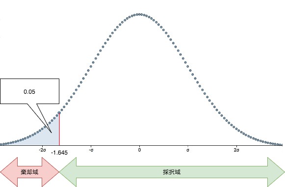 有意水準5%で、左片側検定の棄却域は-1.645になります。
