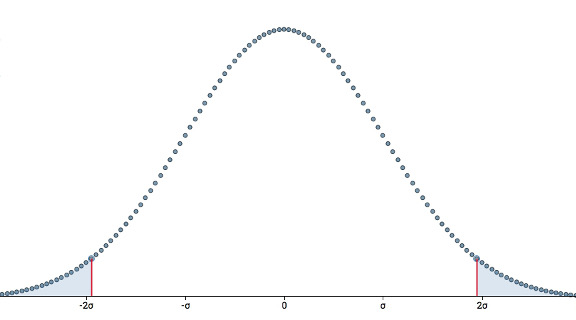この基準を有意水準といい、αで表します。基本的には0.05か0.01を選択し、正規分布全体の面積を1として考えるので、それぞれ5%と1%です。