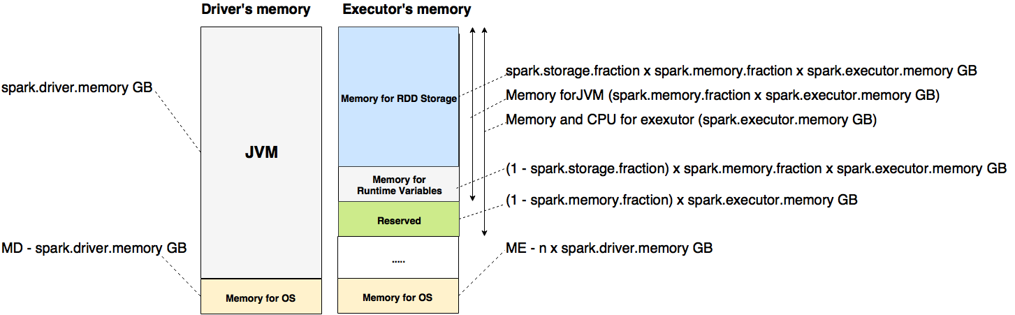 - spark.storage.fraction:JVMが使えるメモリのうち、RDDを格納した部分です。spark.storage.fractionは高くなればJVMのゴミを回収する時間が長くなります。一般的に、この項目はデフォルト値(0.5)を設定します。