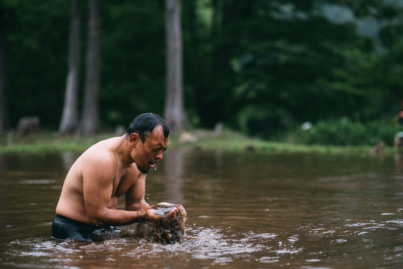 - 池の中に落とした小銭を探す男性