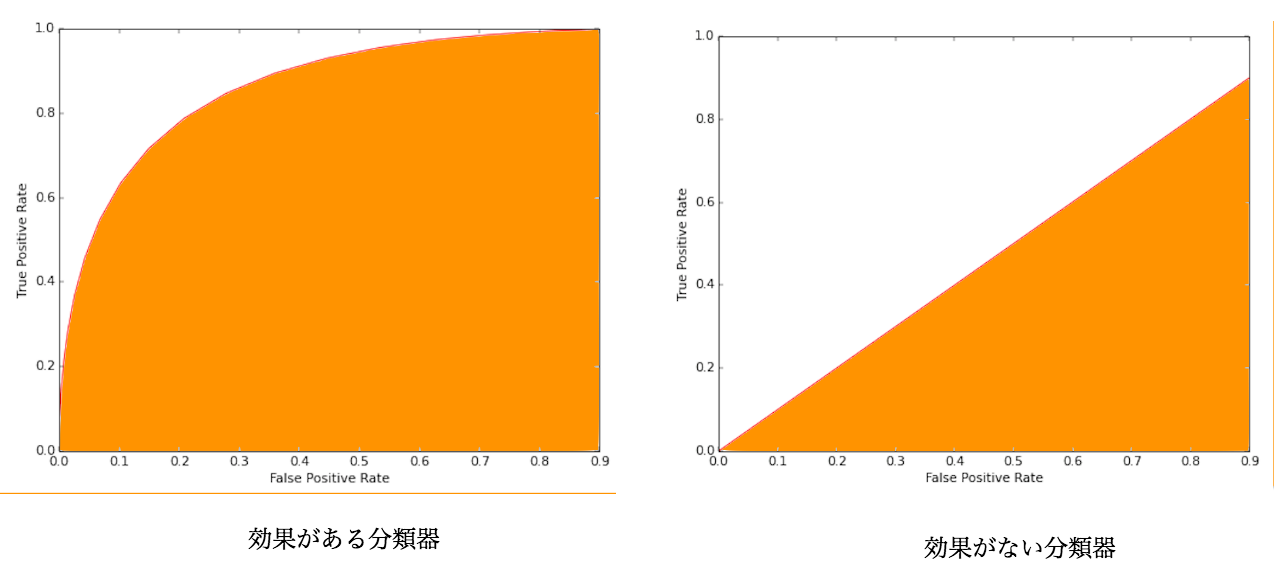 図4から見るとROC 曲線で分類結果の品質を直感的に判断できますが実際に使う場合に数値の指標が必要です。この為にAUCという分類結果を評価する数値の指標が定義されています。