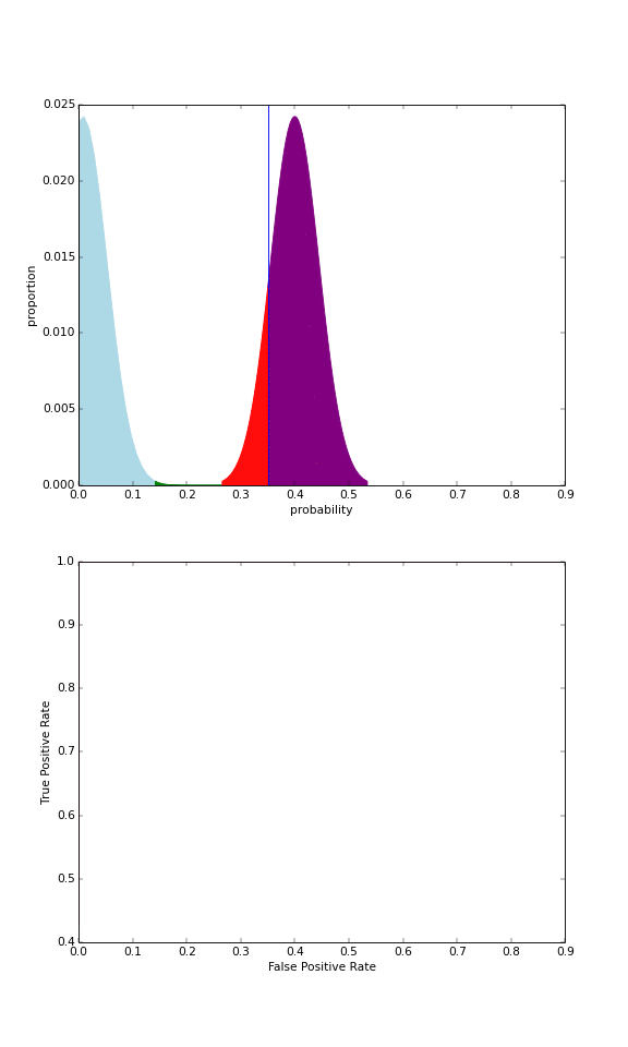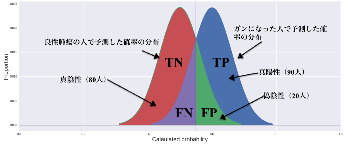 ROC 曲線は真陽性率や真陰性率を組み合わせて作成した曲線です。図2の上半部分が良性腫瘍の人とガンになった人で予測した確率の分布図です。その中に青い部分が真陽性の分、赤い部分が偽陽性の分、紫部分が真陰性率の分、緑部分が偽陰性の分です。青い線はガンになるか判断する予測した確率の基準値です。