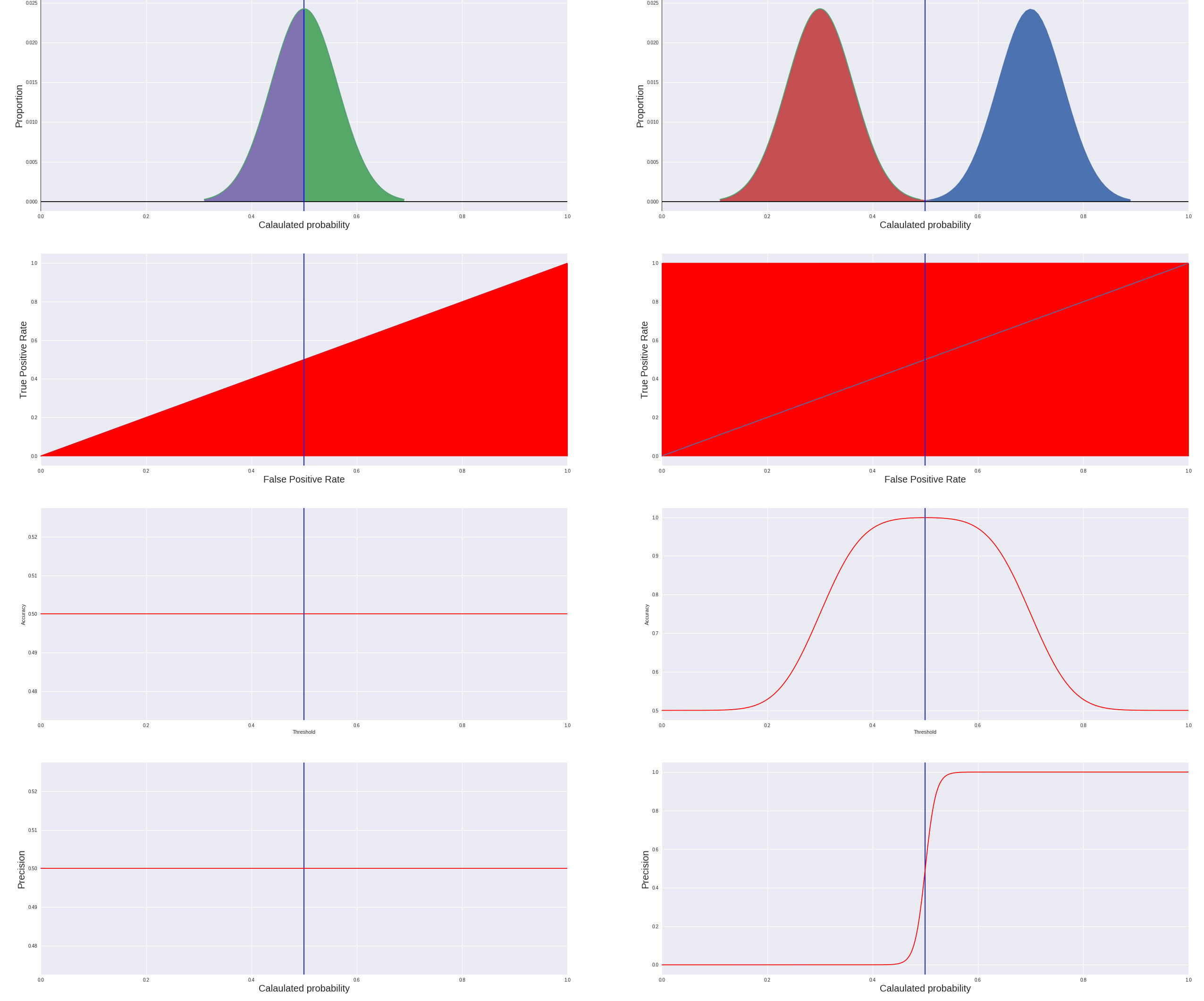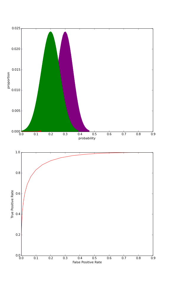 ROC 曲線では分類の基準指標や悪い分類の基準指標を直感で判別できます。分類器の効果は各分類の母集団で予測した確率の分布に依存されています。