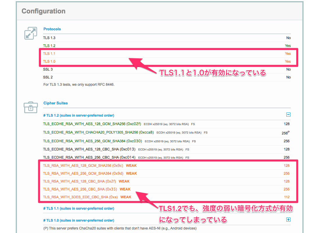 TLS1.2の内部で利用される暗号化方式(Cipher)で強度の弱い方式が有効になっているため、これも無効化する必要があります。