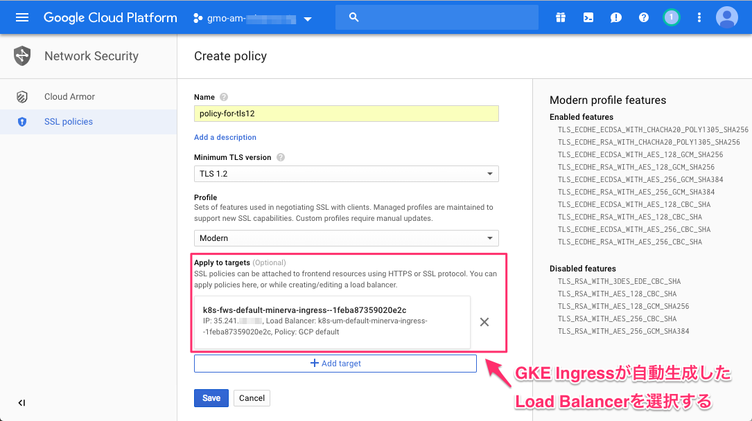 作成したSSL Policyは、Apply to targetsから直接、GKE Ingressが生成したLoad Balancerへ紐付けることが出来ます。