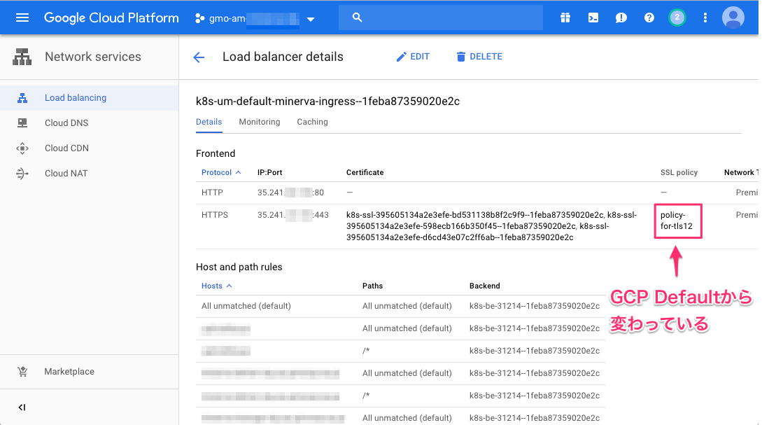 SSL Policyが正しくFrontend(forwarding rule)に紐付いているかは、Network servicesのLoad Balancing画面で確認できます。