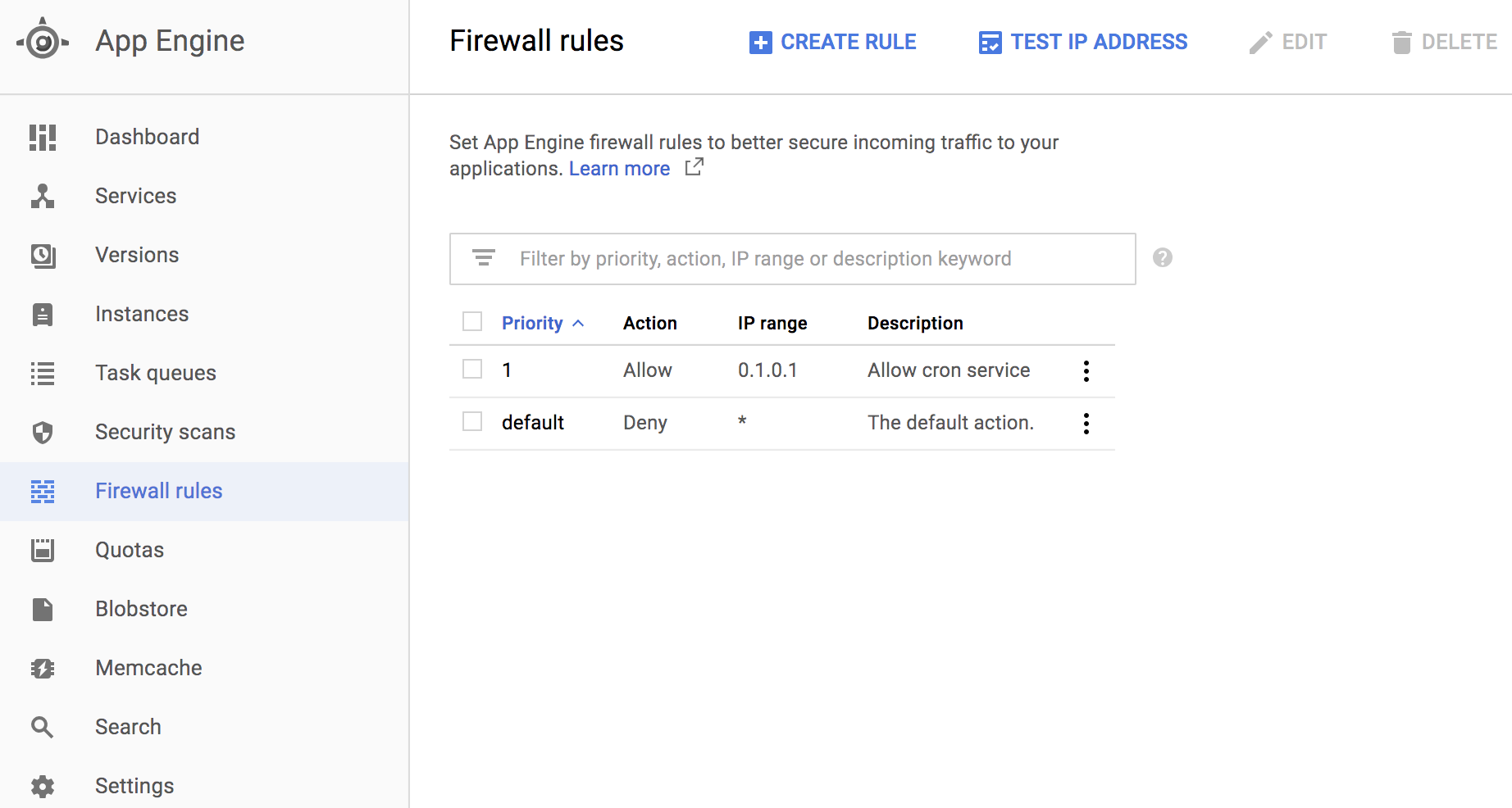 - Firewall rulesを設定します。GAEでCron サーバーのIP Address以外を拒否します