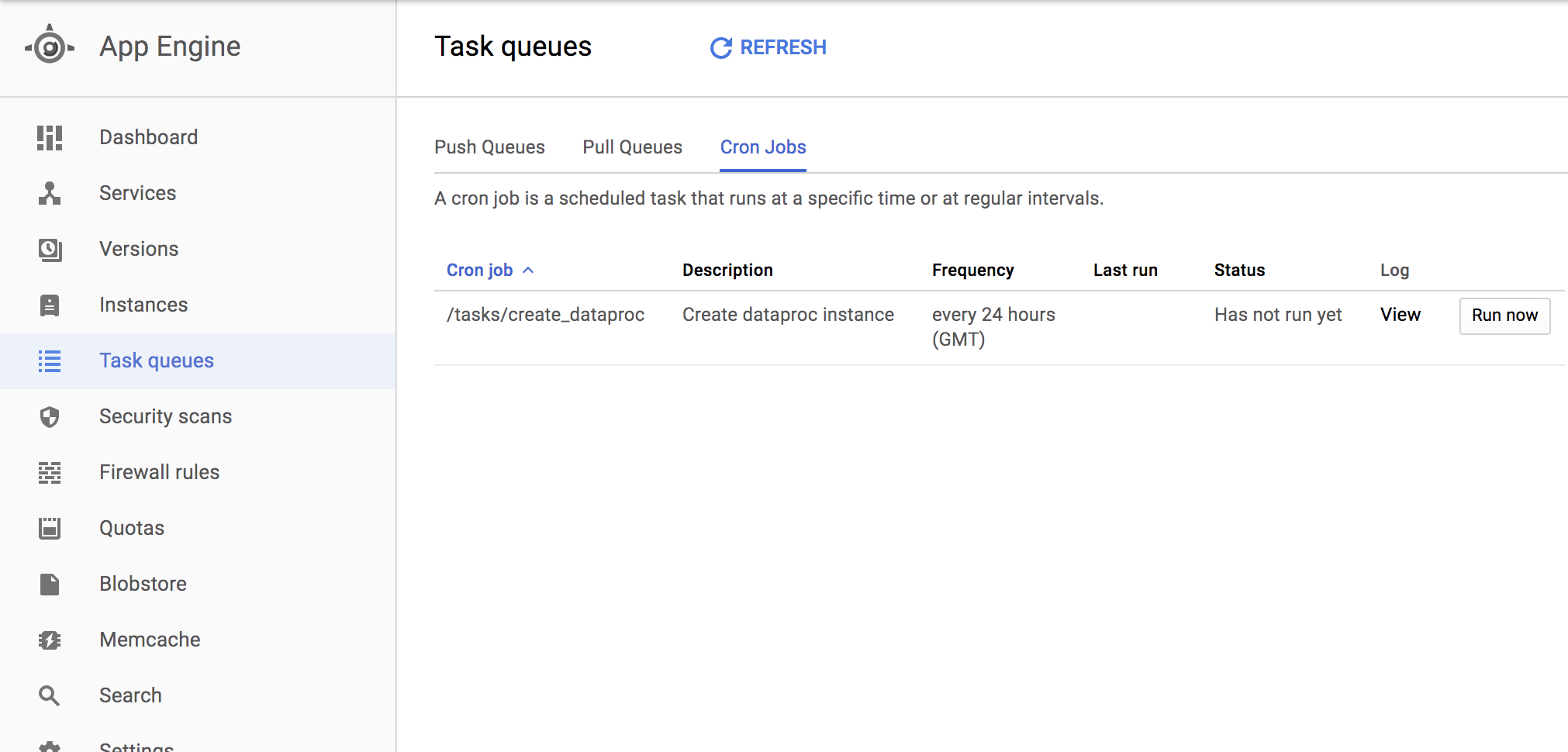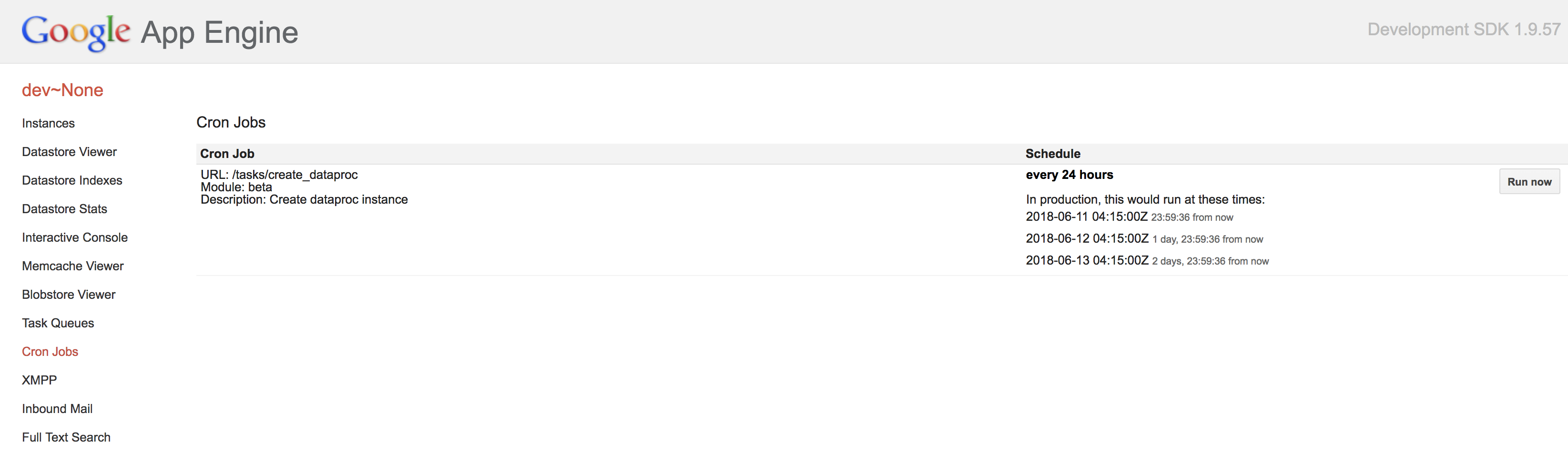 GAEの管理画面から、Cron Jobsを選択して「Run now」buttonを押しコードを起動します。