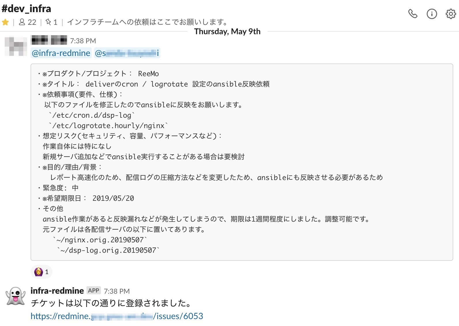 @infra-redmineにフォーマット化された依頼事項を送ると、そのままRedmineに登録されます。そして発行されたチケットのURLがまたSlackにポストされるといった仕様です。
