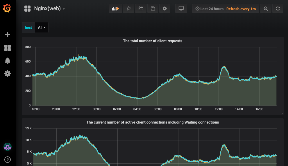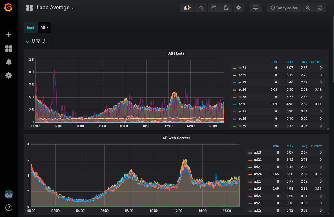 Grafanaを使って、各サーバーのメトリクス(LoadAverage、Memory、Swap、etc)やレスポンスタイム、リクエスト数などを可視化しています。