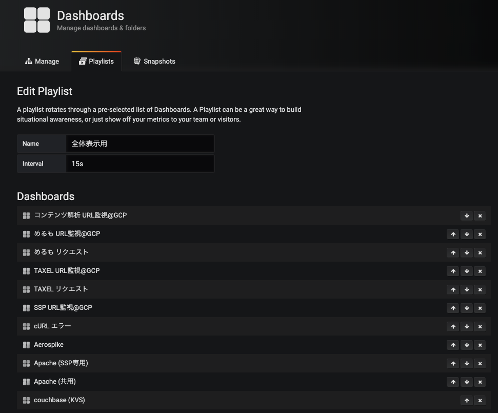 また、Grafanaには各ダッシュボードをローテーションして表示するPlaylists機能があり、一定間隔でさまざまなダッシュボードを表示するよう設定しています。