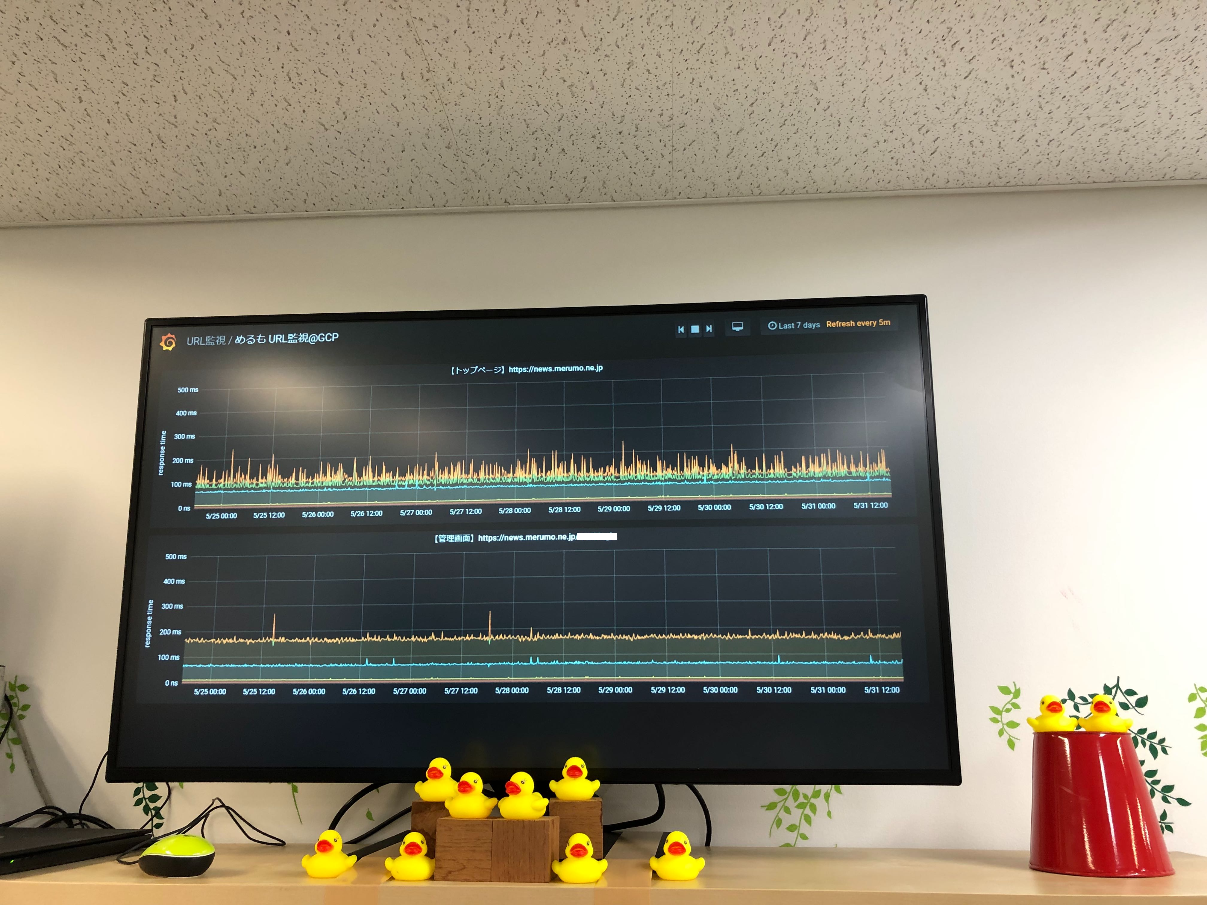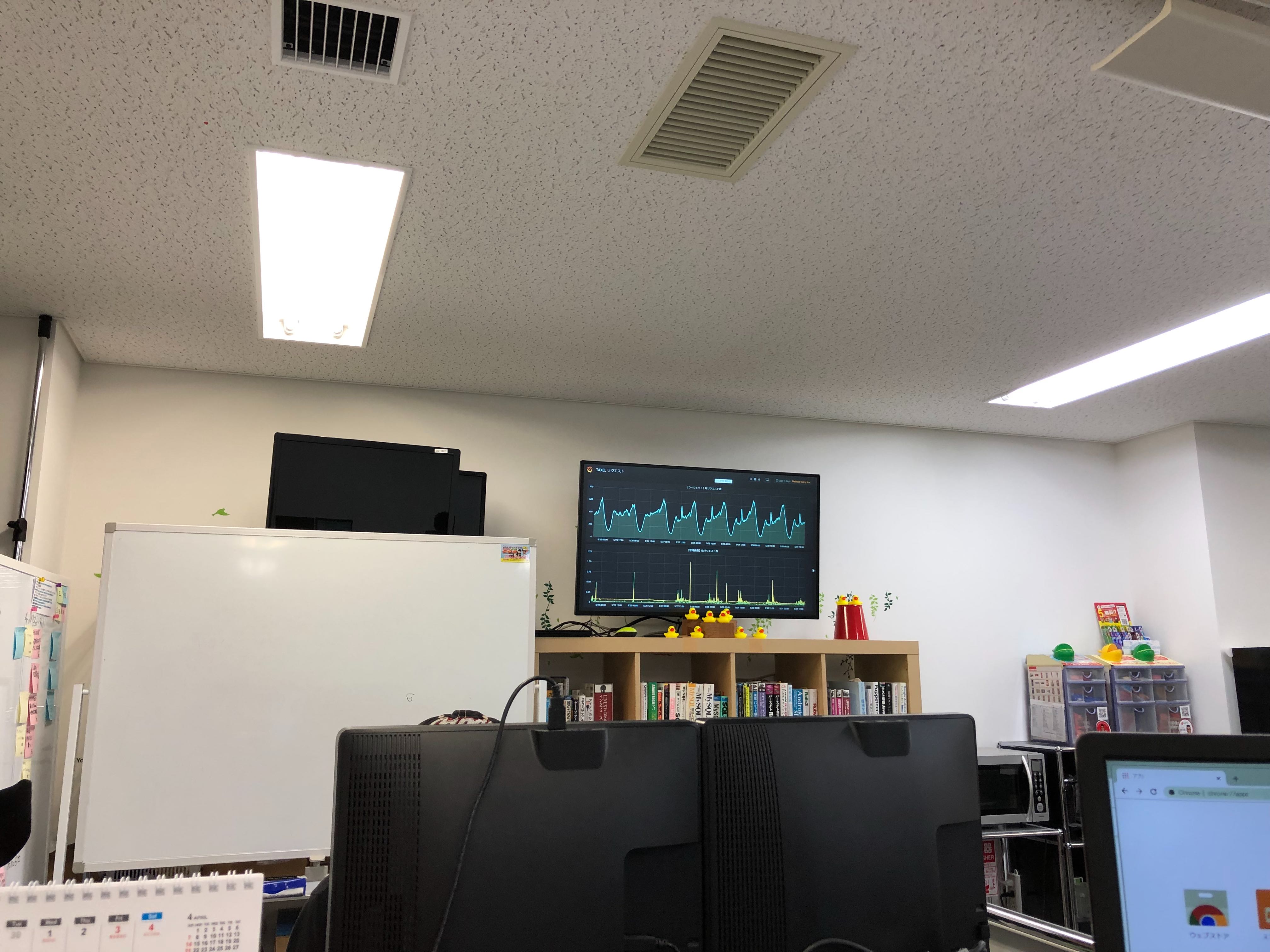 Grafanaはこれまでもインフラチーム内で定期的に見るようにしていましたが、常時表示する事によって変化に気付きやすくしたいという思いから今回の改善を行いました。