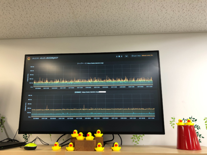 Grafanaはこれまでもインフラチーム内で定期的に見るようにしていましたが、常時表示する事によって変化に気付きやすくしたいという思いから今回の改善を行いました。