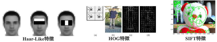 1. コンピュータグラフィックス学に基づいて手動で設計した特徴(明暗差、角度、向き)で機械学習の分類の問題として解決。代表的な手法はHaar-Like、HOG、SIFTです。