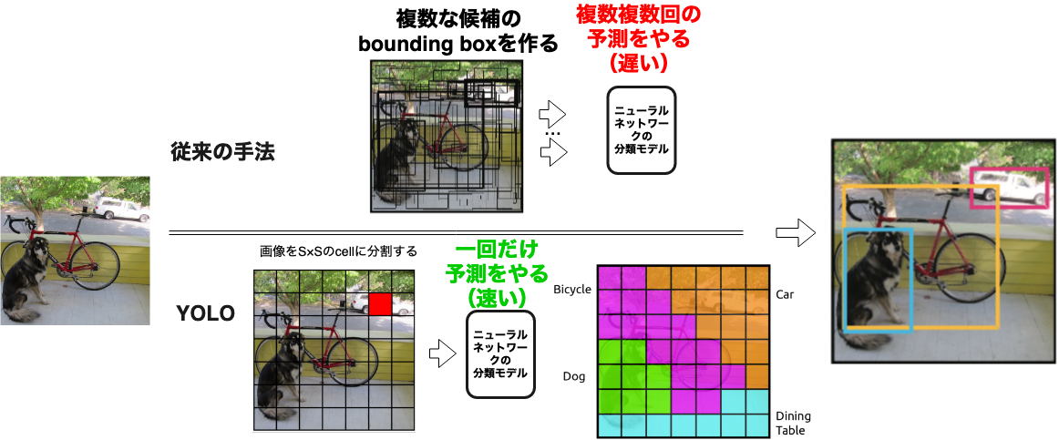 物体検出は二つの問題があります。位置の検出と種類の検出します。従来の手法で位置を検出のために複数な候補のBounding Boxを作って分類の計算を複数回でやります。最後は信頼度が一番高い結果を出力します。分類の計算はとても時間が掛かるので予測は遅くなります。