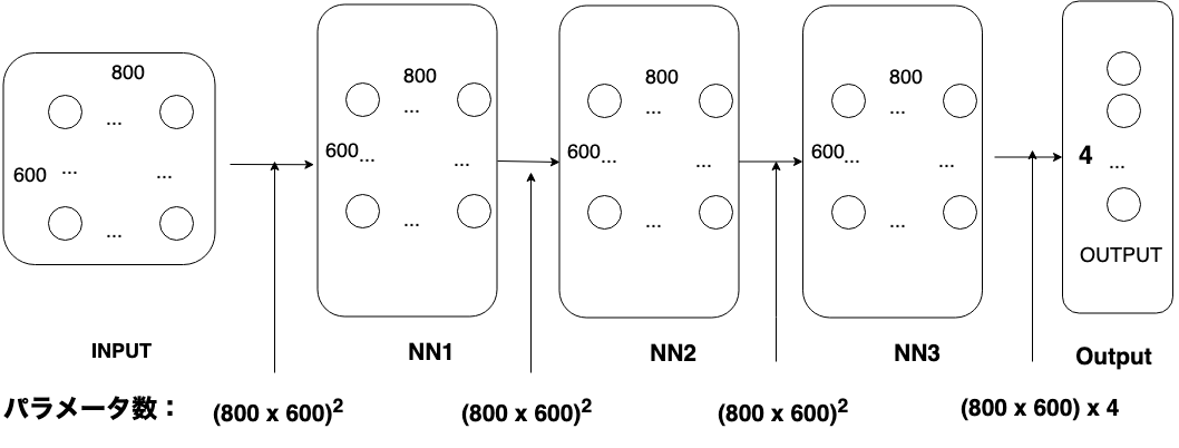 ニューラルネットワークのイメージで一つのコネクションに対してユニットの関数によって少なくても学習するパラメータ一つがある。例えばある五層の全結合ニューラルネットワークで800*600の写真を認識するモデルを学習したいちする(図9)。想定された結果は4分類ある。(Output Layerのユニット数は4)。このモデルで計算するパラメーター数は4x(800×600)2 + 4 x 800×600 = 92 億(1012)だ。この量のパラメータを当時の計算力でモデルを学習することは無理です。