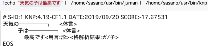 形態素解析システムJUMANの解析結果(形態素列)を入力とし、文節および基本句間の係り受け関係,格関係,照応関係を出力することができます。引用元 | KNP – KUROHASHI-KAWAHARA LAB、2019年09月24日、 http://nlp.ist.i.kyoto-u.ac.jp/index.php?KNP