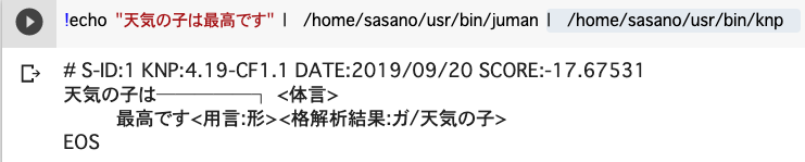 !wget http://nlp.ist.i.kyoto-u.ac.jp/DLcounter/lime.cgi?down=http://nlp.ist.i.kyoto-u.ac.jp/nl-resource/knp/knp-4.19.tar.bz2&name=knp-4.19.tar.bz2 !tar jxvf knp-4.19.tar.bz2 !cd knp-4.19 && ./configure --prefix=/home/sasano/usr --with-juman-prefix=/home/sasano/usr && make && make install !pip install pyknp |