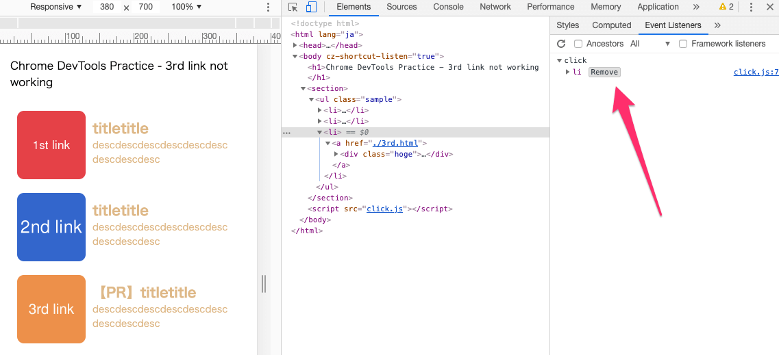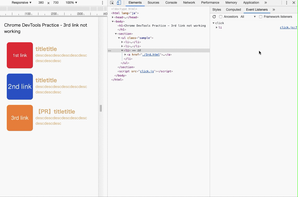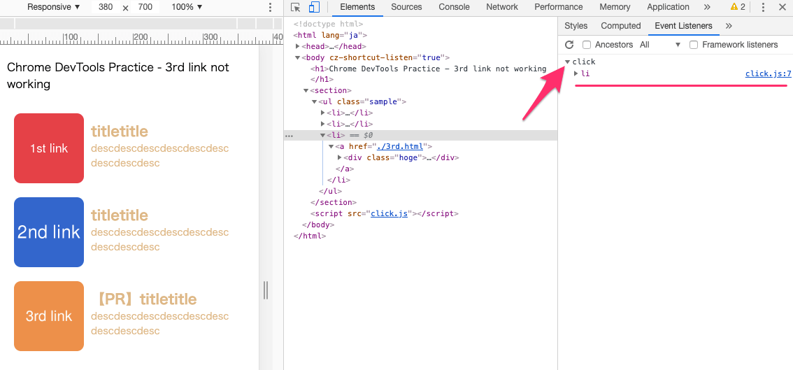 『Elements』パネル内にて、DOMノードを選択(クリック)します。するとそのノードに紐づいたイベントリスナーが表示されます。今回は問題のある3つ目のliタグのノードを選択しています。